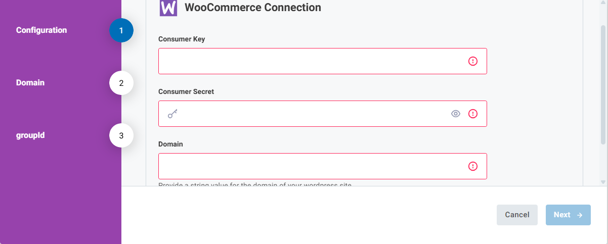 Fill in with your Authentication details to Connect to WooCommerce then click Next button