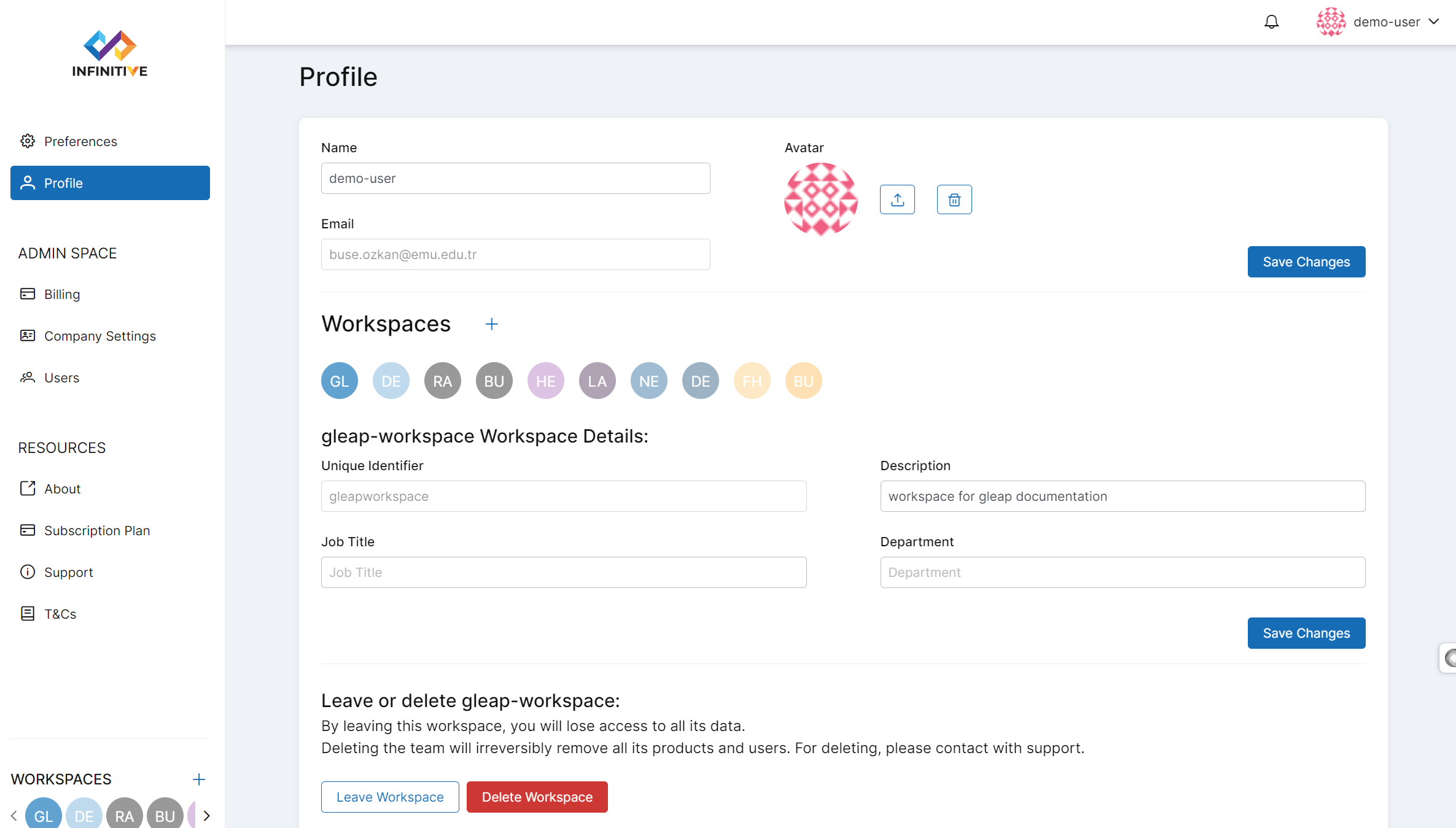 when you go into Settings and Preferences you can see your profile data, workspace data etc.